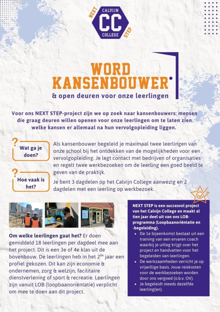 Wij geloven dat leerlingen het meest leren door echte ervaringen. Daarom organiseren we meerdere keren per jaar het NEXT Step-project, waarbij leerlingen via werkbezoeken zelf kunnen ervaren welke vervolgopleiding nodig is voor een bepaald beroep. Wil jij écht een verschil maken en een leerling twee onvergetelijke werkbezoeken laten ervaren? Lees deze FOLDER, neem contact met […]