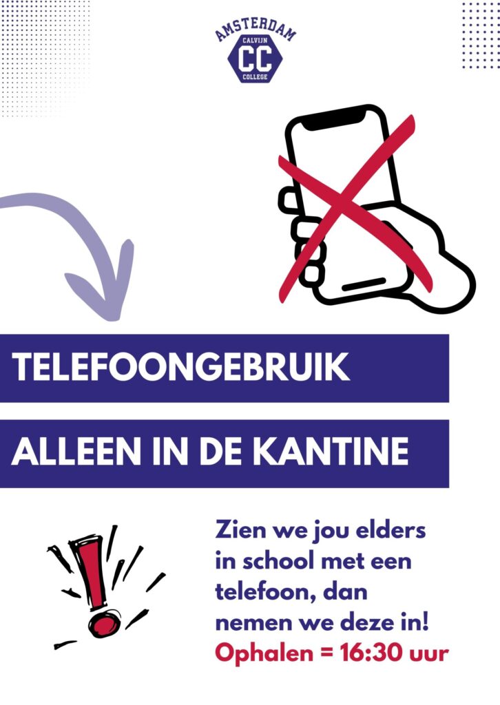 De overheid heeft besloten dat vanaf 1 januari 2024 het gebruik van mobiele telefoons, tablets en smartphones in de klas niet meer toegestaan is! Een mobiele telefoon heeft in de klas geen functie. Mobiele telefoons leiden af en zorgen ervoor dat leerlingen slechter presteren. Op het Calvijn College mag je je telefoon alleen in de kantine gebruiken.